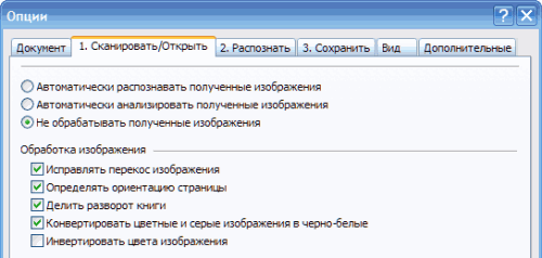 В открывшемся окне, во вкладке Сканировать/Открыть, отмечаем пункт Не обрабатывать полученные изображения, так как распознавать текст мы не будем - нам нужно только изображение. Выбираем параметры Обработки изображения: